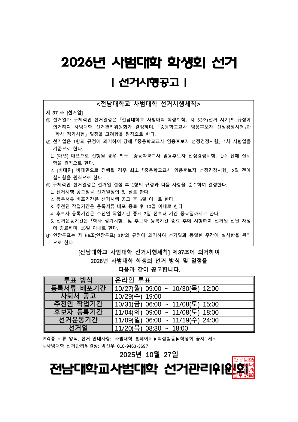 전남대학교 사범대학 선거시행세칙 제 37조에 의거하여 2026년 사범대학 학생회 선거 및 일정을 다음과 같이 공고(2025.10.27.)합니다.